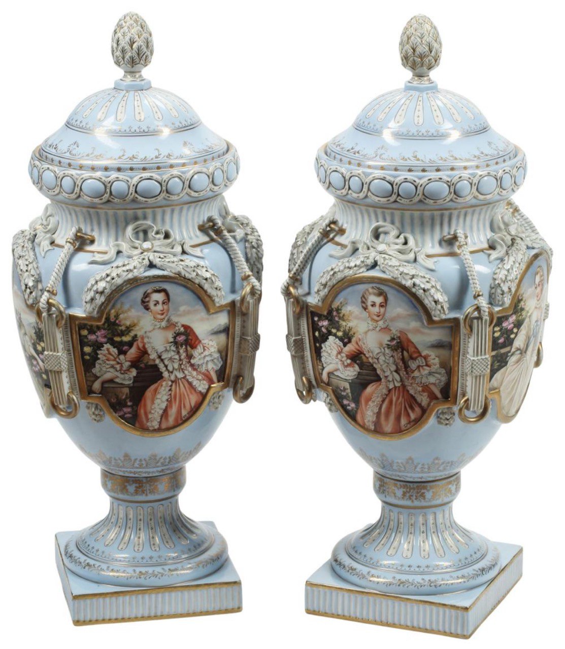 Крупные дрезденские фарфоровые вазы с крышками, конец XIX века.